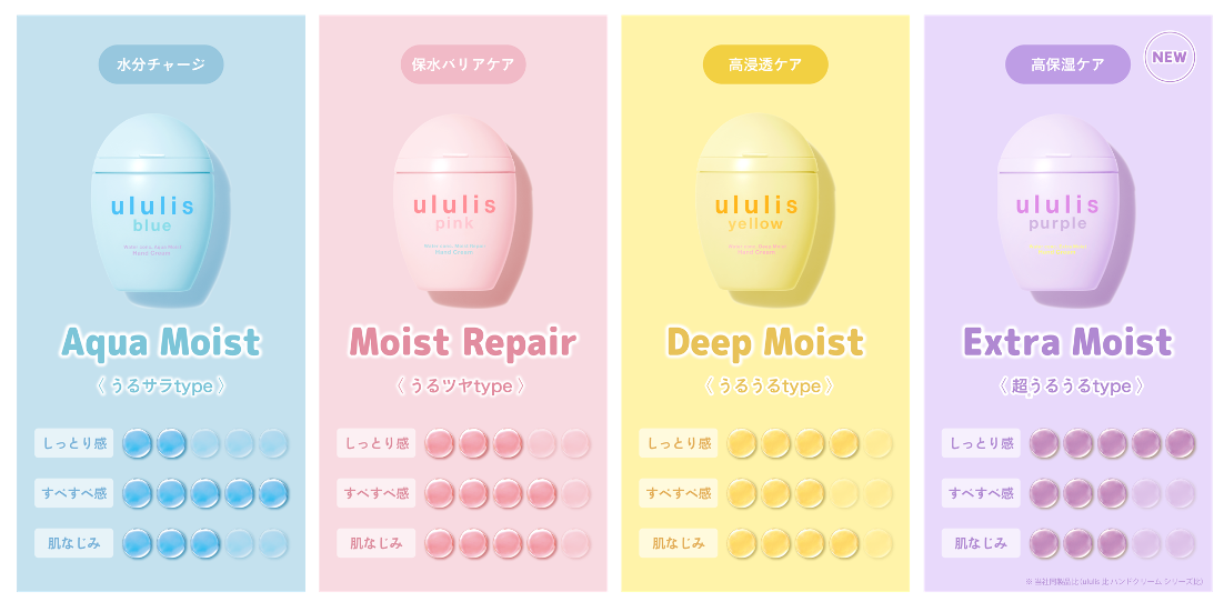 ululis(ウルリス)が、リニューアルした3種に新しく“超しっとりタイプ”のパープルを加えた4種の「MIZUハンドクリーム」を、2025年10月4日(土)より全国のドラッグストア・バラエティショップ等で発売する。