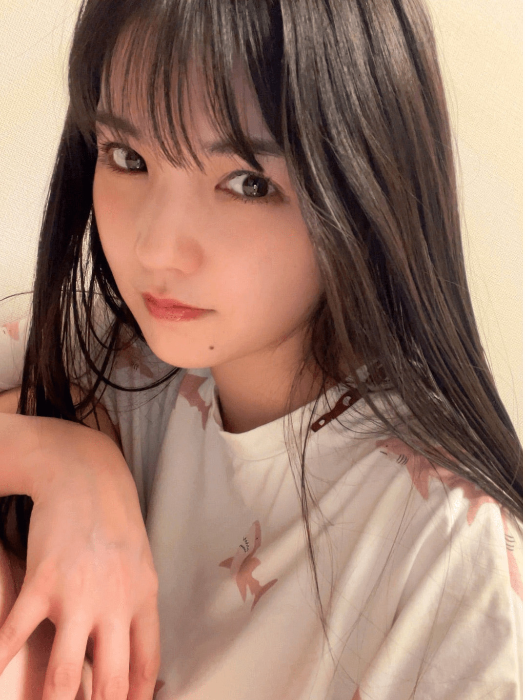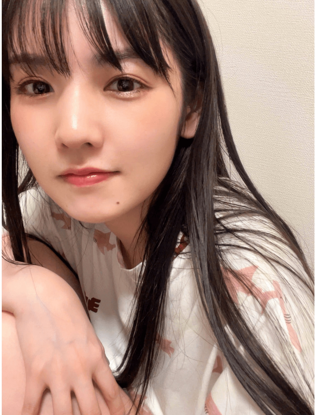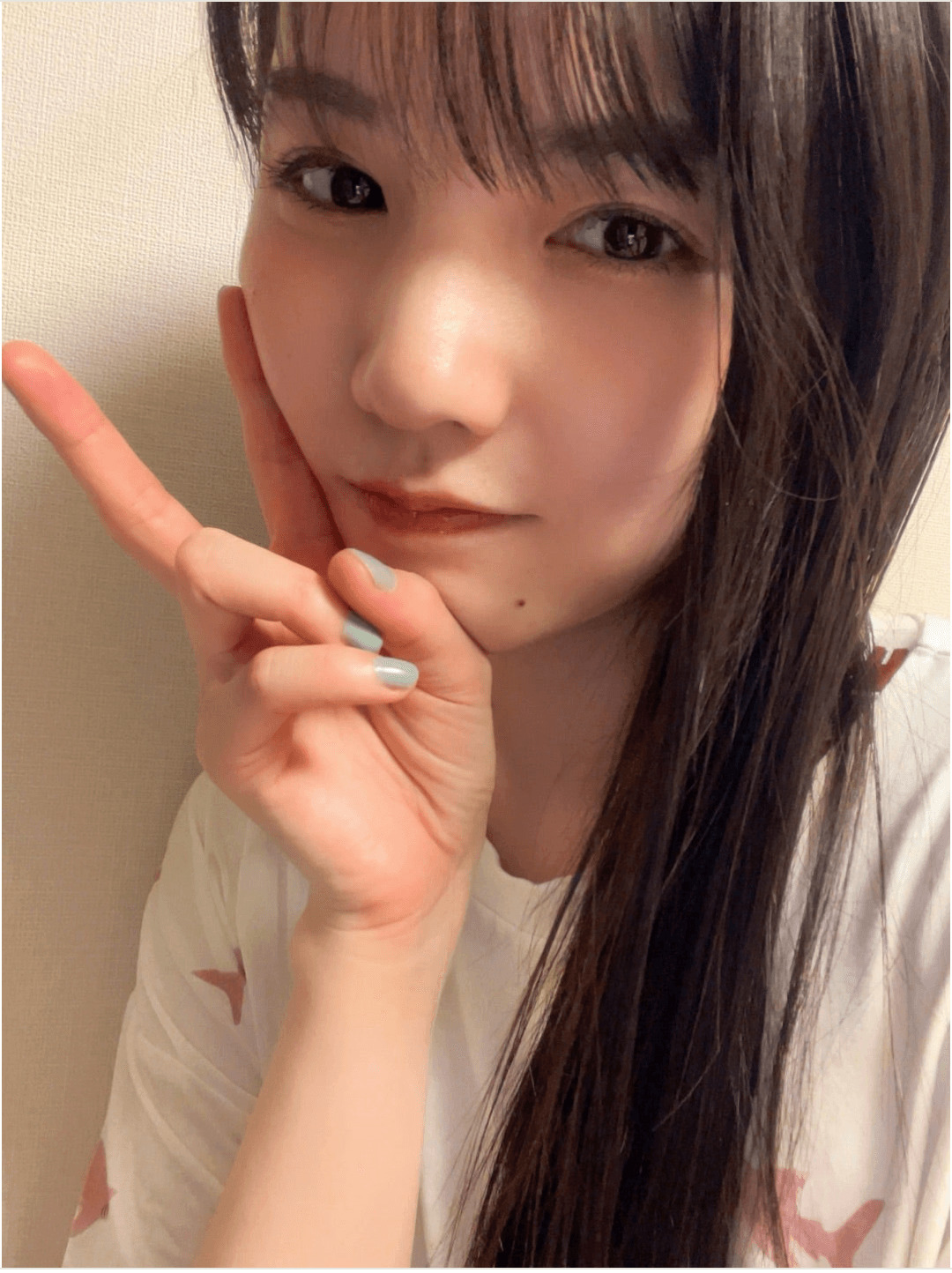 続けて、「あ、写真は、全然、前の、、、自撮りです」「いっぱい撮ってた」「なんか、前に撮ってたけど 載せてない写真って結構あるんよなぁ〜 似たり寄ったりな写真多いけどね!笑」「ラスト!! だけ、すっぴん」と綴ると、すっぴん姿を含めた、ルームウェアの自撮りショットを複数公開した。