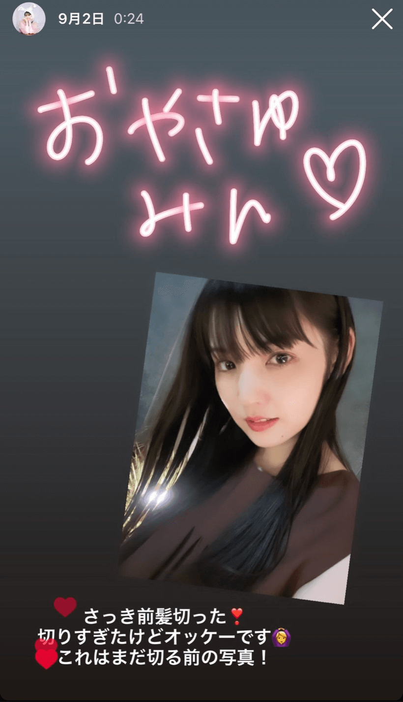 道重は、自身のブログにて、「こんばんは〜 今日は、 リハーサルだったよ!!」「ねぇ私! 絶対に! 前髪切りすぎてる」「汗ちょっとでもかいたらめちゃ短いんやけど!?」と切り出すと、「9/2のインスタストーリーにさ 切りすぎたけどオッケーです とか言ってるけど どう考えてもNGなんやけど! 笑」「10日までに伸びるかね!?」「頑張って伸ばそっと」とコメント。